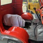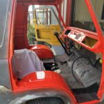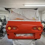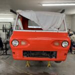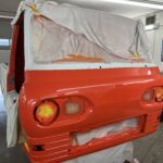 On the Econoline I wanted to have a two tone paint scheme. The orange was sprayed first and then the white was sprayed over top where I wanted. I used a Frog tape to do my paint lines as it was less sticky but still gave protection to the paint I wanted protected from the new color. Before the clear coat was applied we wet sanded with 3000 grit the transition line between the two colors. This helps eliminate feeling the transition where the extra coats of the new color are being applied over the other color. I started this painting of the vehicle in the interior including the cab and dash area as well as the door jam areas. Now I don’t have to worry about overspray on the outside of the vehicle when those panels are painted. The nose of this truck was my next choice of panel to paint.