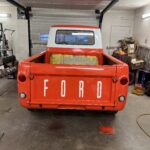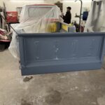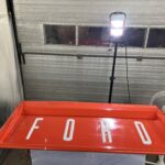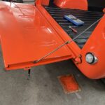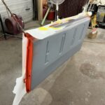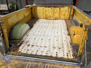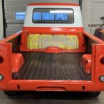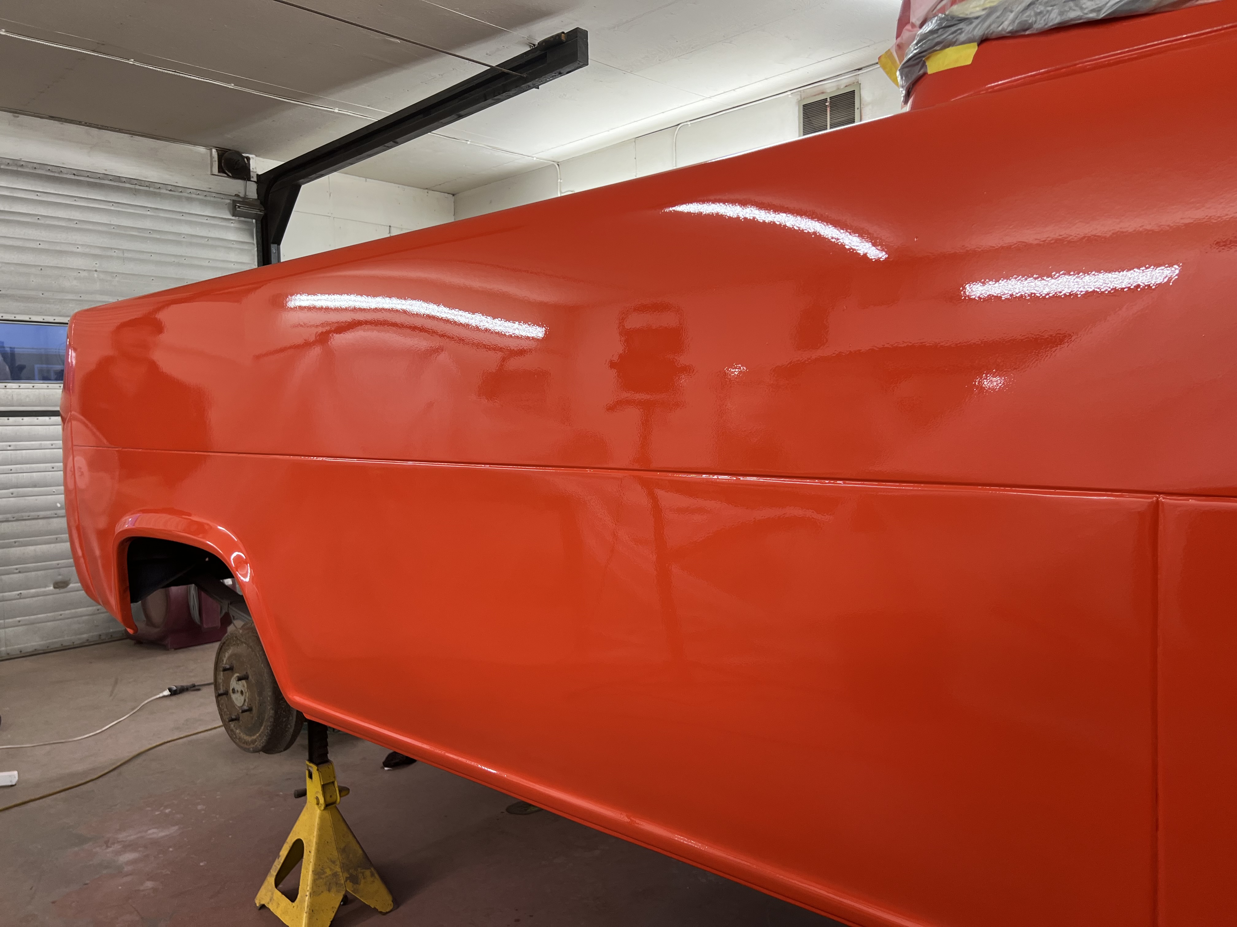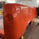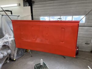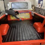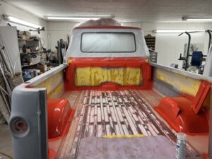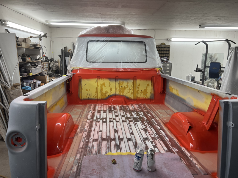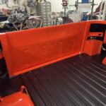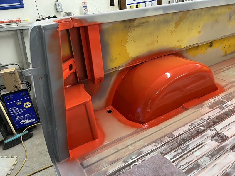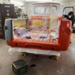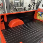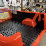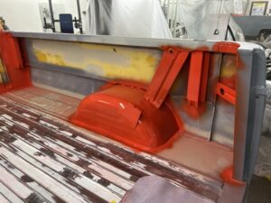 Here the bed liner was applied so all the orange panels had to be masked out after being sprayed days before.  I am happy with the results of this method.  It isn’t cheaper by any means.  If I had to complain about something it would be the high build primer I used that is a 2k product (had a hardener button on bottom of the can that is pressed to add it to the product).  This primer does not have the same coverage ability as primers I have used with a gun.  I just can’t mix the right amount to do a panel at a time that it would waste so much product.  I don’t want to be priming larger portions in my building due to the overspray….and primer goes everywhere and sticks really well like it was intended.