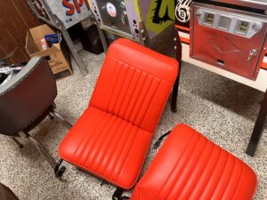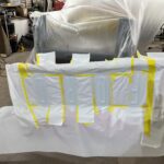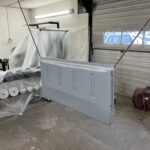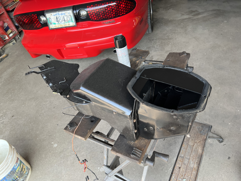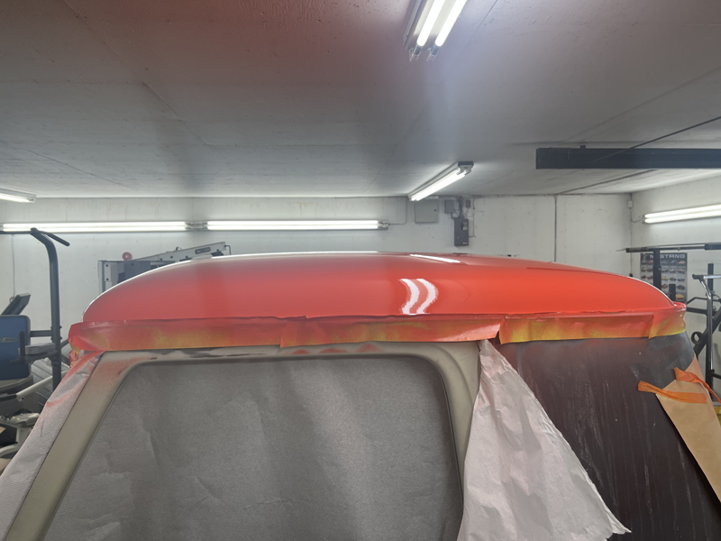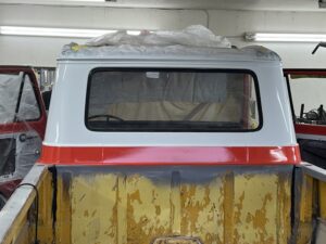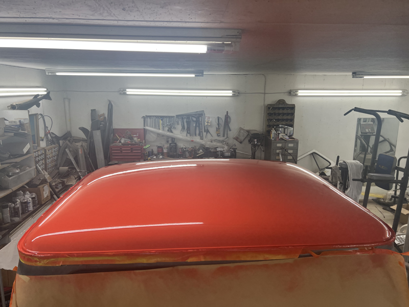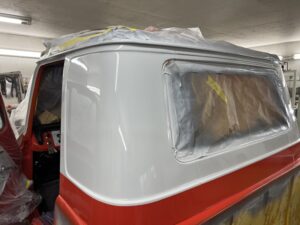 I included a few different photos in this last gallery.  The heater box was removed and torn down.  It was cleaned and painted for a clean finish.  We made sure that the fan was working as it should.  The seats I had reupholstered and ready to go a while back in this build.  It is so much easier to have as much ready to be assembled in to the finished product as possible.  The side mirrors were ordered as were all the new weatherstripping and window felts.  The roof was painted in my shop which did not allow for head room.  It was the trickiest of all the panels to lay down the base and the clear.  It was just long enouth that I couldn’t reach the entire roof from either the back, the front or either of the sides so I had to have milk crates set up around the vehicle to walk on to have a constant flow from the aerosol can.