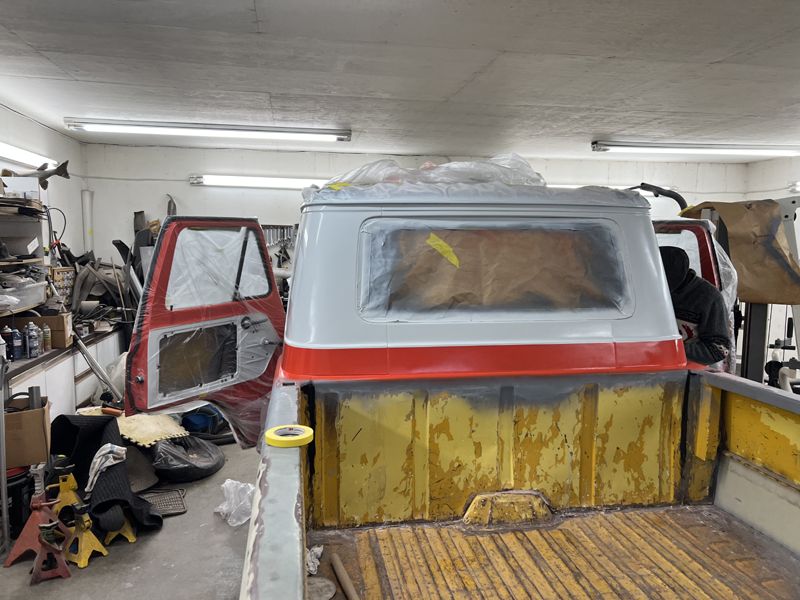 The bed was sanded and cleaned for bed liner being applied.  The prominent parts that were to be painted were masked and done before the bedliner was applied.  The paint on roof and sides of the vehicle were also done.  Note, this process was done on several different days.  I did not paint all the panels on the same day.  I did not want to have overspray all over my shop and it is easier for me to concentrate on one panel at a time to bet the best job I could.    I would have bright lights on what I was spraying allowing me to see if I had the right amount of clear on the panel to meld smoothly.  Underspray results in a bumpy texture and overspray leads to runs in the clear.  I also kept a heat gun close by if I felt that I applied too much clear to a horizontal panel   I would speed the curing up with light heat to stop the run from occuring.