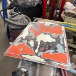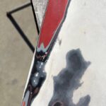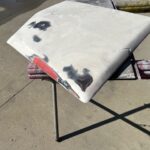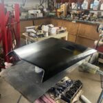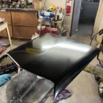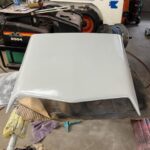 I used an orbital sander with 150 grit to buzz the layers of old paint, primer, sealer, to the original white fiberglass. The cracks in the scoop surface now could be seen. I used a small grinding bit on my Dremel tool to make a valley through the cracks so that I could re fill the trough I had made with fiberglass liquid resin. I had watched a Youtube video a while ago stating not to use too much liquid hardener in the resin and that only a few drops were needed. I used only a few drops and applied cloth and resin in layers to build up where it was broken. Initially I used a fiberglass putty on the out side to hold the pieces together so that the work could be done with the cloth layers on the inside of the scoop. There was a piece missing out of the back of the scoop that I had to build up as well. The next day my resin was still sticky and wet. A few drops……for sure. Thanks Youtube genius for leading me down that path. Now I had to add more layers hoping that my new potion of hardener and liquid resin would saturate the bottom layers that were not drying. This is a chemical process to induce hardening. You can feel the heat being released as it hardens. By the next day all seemed fine, hopefully, or pieces of that scoop will fly off while I am driving. I don’t like working with fiberglass resin. As I sanded the white fiberglass body to level where I filled the trough I had made through the cracks with the resin, the fine dust landed on my clothes and exposed arm. The itching began soon after. Small glass particles were imbedding in my skin. An orbital with a vacuum attachment would have been greatly appreciated. I do not possess such a set up. Once sanding was finished I sprayed a couple of coats of primer surfacer on the scoop. After block sanding this I sprayed a sealer on the surface and then proceeded to paint. I will use a primer sealer that is a 1 k sealer on fiberglass items or where I am scared the solvents in the paint will react with the underlying layers. The semi gloss black trim paint I am using has lots of solvents to allow it to flow out of the aerosol can. Light coats are needed. The next day I could see a couple of body work flaws on the surface that I could not see as I sanded the primer surfacer. Here again my inner voice told me to leave it alone because it was good enough. My inner demon took over again and I sanded the imperfections out. Now I needed to re prime the areas I had to sand right down to the fiberglass body to fix. Now the primer reacted horribly with the solvents that were still gassing off from the black paint. This was a day later but obviously it was too soon. Now I had to re sand the reaction areas and block sand again and this time I just used the sealer to cover the areas. Usually the sealer is more forgiving as long as you only apply light coats. I eventually got it sprayed with two coats of black again and it looks better. This job should not have been this difficult. Had I used a light mist top spray on the surface before the black I would have found the imperfections and fixed before applying the black solvent laden paint. All of these products are not cheap to purchase. I hate wasting product from either stupidity, laziness, or just poor eye sight. Not sure which one of these could be applied to this situation. This is another pain in the ass job complete and waiting for installation in the future. The more of these smaller jobs that can be accomplished ahead of the car being completely painted and waiting parts installation the better. These small jobs can be frustrating if done at the end. They require concentration, time and effort and I know not to let these task wait until the end of the build. It is here at the end that I might just settle for poorer quality to get the car on the road. Ps, last week I found a scoop in Winnipeg for the same price that I had paid for this scoop, but was without the broken pieces. Sometimes you can wait and find better pieces but sometimes it is hard to find at all. The yellow Comet I built a couple of years ago I purchased a whole car to get the scoop and the mirrors for my build. It turned out that I used the engine as well so it wasn’t so bad to have to buy a whole car for only a few pieces. This is what a person has to do now unless you are starting out with a really complete project.