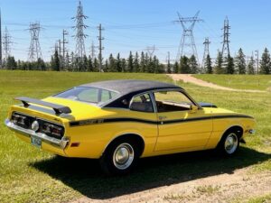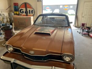 This car was a base cougar with a 351 Cleveland 2 V engine and automatic transmission. It has really cool seats called Hounds Tooth pattern in black and white. It even had the hounds tooth vinyl top that has faded over the years and some rust is bubbling under this roofing material from trapped moisture. Vinyl roofs were notorious for trapping moisture and causing rust to form. I will eventually strip off the vinyl, repair the rust and spray bedliner on the roof to simulate the vinyl. It is a clean look and will not trap rust under the sprayed material. This is the same procedure done to my Comet. It is by far way cheaper to do it this way and you don’t have to glue your fingers together and get clumps in your hair putting it on.