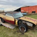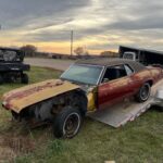 Well onto a new project. I have known about a 1970 cougar that has been off the road for 40 years or more. It has been sitting at a friend’s yard and I have been looking for parts for it for some time. It is missing the entire front clip except for a hood that needs some work. The engine is in the vehicle but is seized. All of the antifreeze has turned into a rust colored dry rot mess throughout the engine and cooling system from sitting. I am tackling this project in an order that allows for this vehicle to move under its own power so that it doesn’t have to be pushed in and out of the garage all of the time. First things first so I went to get the Cougar with my trailer. The car was originally in a barn for most of its time at the current location until about six years ago when it was pushed outdoors in the elements. Grass grew up all around and underneath it. Grass is known to trap moisture against the metal underneath causing an orange rusty look to the unprotected metal parts. Even the floors that have some sort of undercoating sweat and begin to rust. Time to get to work and save another car from the crusher or from another garage to be left to an uncertain future wanna-be build.